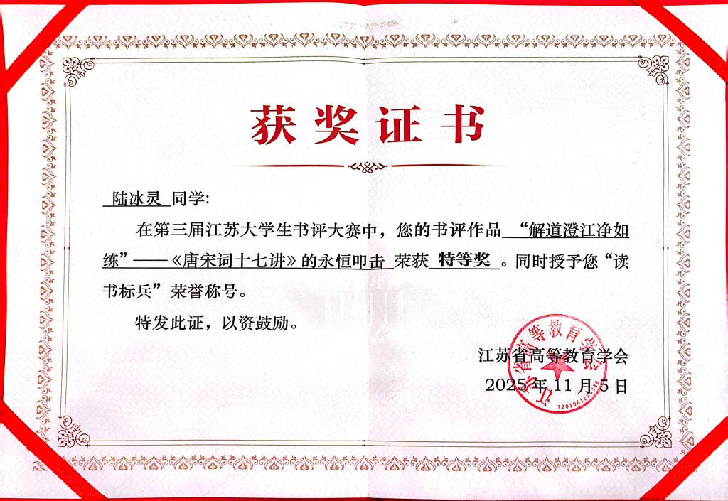 近日,第三届江苏大学生读书文化节圆满闭幕,其核心赛事——书评大赛结果揭晓。我校共推荐5个作品,最终3个作品荣获特等奖1项(全省仅12项)、一等奖1项、二等奖1项。其中,文学院2024级学科语文专业研究生陆冰灵同学的作品《“解道澄江净如练”——<唐宋词十七讲>的永恒叩击》荣获大赛特等奖,于2025年11月12日应邀参加闭幕式和颁奖典礼。